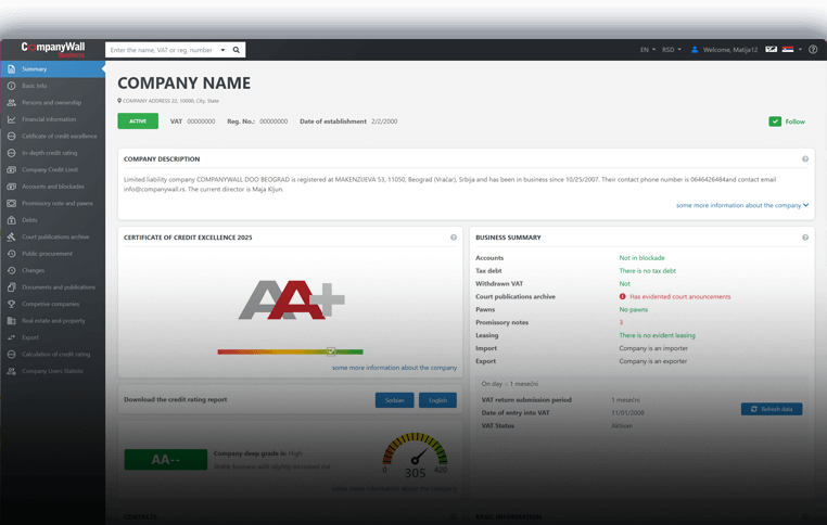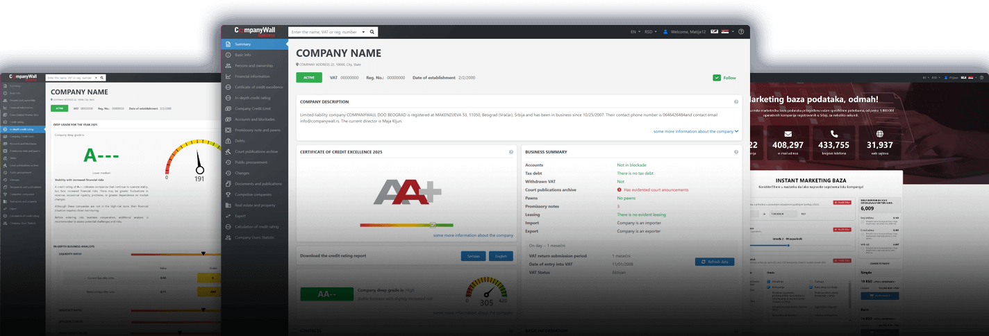 CompanyWall Business objedinjuje bonitetne ocjene, koeficijente likvidnosti, podatke o zaduženosti i povijesti blokada. Sve su informacije prikazane pregledno i lako dostupno, što omogućuje brže i sigurnije donošenje odluka.